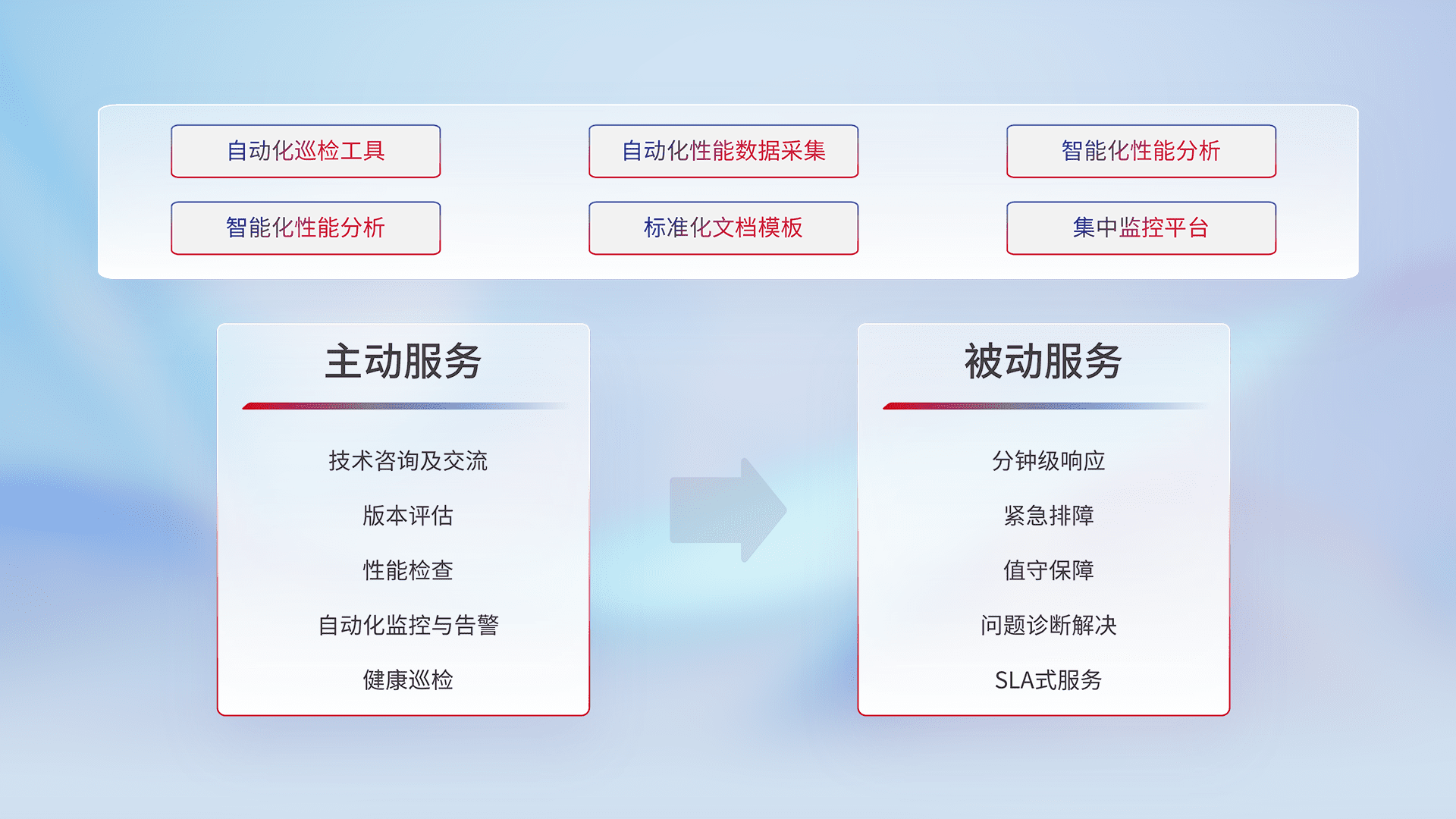 智能化工具和标准化文档,,保障服务质量,,提供主动服务(包含技术咨询、、、、版本评估、、性能检查、、、、自动化监控与告警、、、、健康巡检)和被动服务包含(分钟级响应、、、紧急排障、、、值守保障、、、问题诊断解决、、、SLA服务)。。。